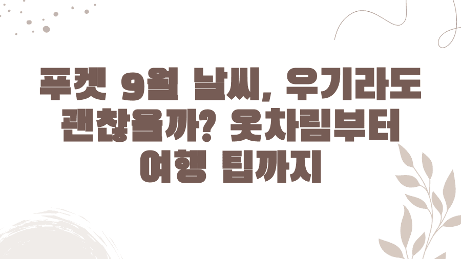 9월의 푸켓, 설레는 마음으로 여행을 준비하고 계신가요? 동남아의 보석 같은 섬, 푸켓은 아름다운 해변과 다채로운 액티비티로 늘 많은 여행객들의 사랑을 받는 곳입니다.특히 9월은 우기가 겹치는 시기라 날씨에 대한 궁금증이 많으실 텐데요. 과연 푸켓 9월 날씨는 여행을 망칠 정도로 비가 많이 오는 걸까요? 아니면 오히려 시원한 바람과 함께 여유로운 여행을 즐길 수 있는 시기일까요?이번 포스팅에서는 푸켓 9월 날씨에 대한 모든 궁금증을 해소해 드리고자 합니다. 평균 기온부터 습도, 강수량, 그리고 예상치 못한 날씨 변화까지 꼼꼼하게 분석하여 여러분의 완벽한 푸켓 여행 계획 수립을 도와드릴게요. 9월 푸켓 여행, 날씨 때문에 망설여진다면 더 이상 걱정하지 마세요! 여러분의 걱정을 덜어드릴 유용한 정보들을 지금..